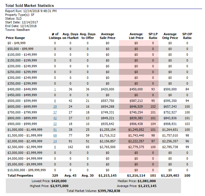 上面图一是Needham最近一年的全部别墅房产销售统计表,我点几个要点:Needham房子销售相当多的价格区间是1 million 到 1.5 million, 一共卖出91套,紧随其后的是1.5million到2 million, 共卖出68套。 而Needham传统价位区60万到1 million的仅有139套,等下对比2009年的数据,大家会吃惊地发现,八年来,Needham涨得很快,向高档区域迈了一大步。 还有一个有趣的现象是,在60万到150万的价位里,所有价位区间的平均售价都比平均开价高!尤其是90-100万这个区间,卖的最快,平均卖出价比开价高4%。这说明,在这个价位区间上,Needham非常受欢迎!看总平均售价,Needham最近一年是121万5,相当不俗。